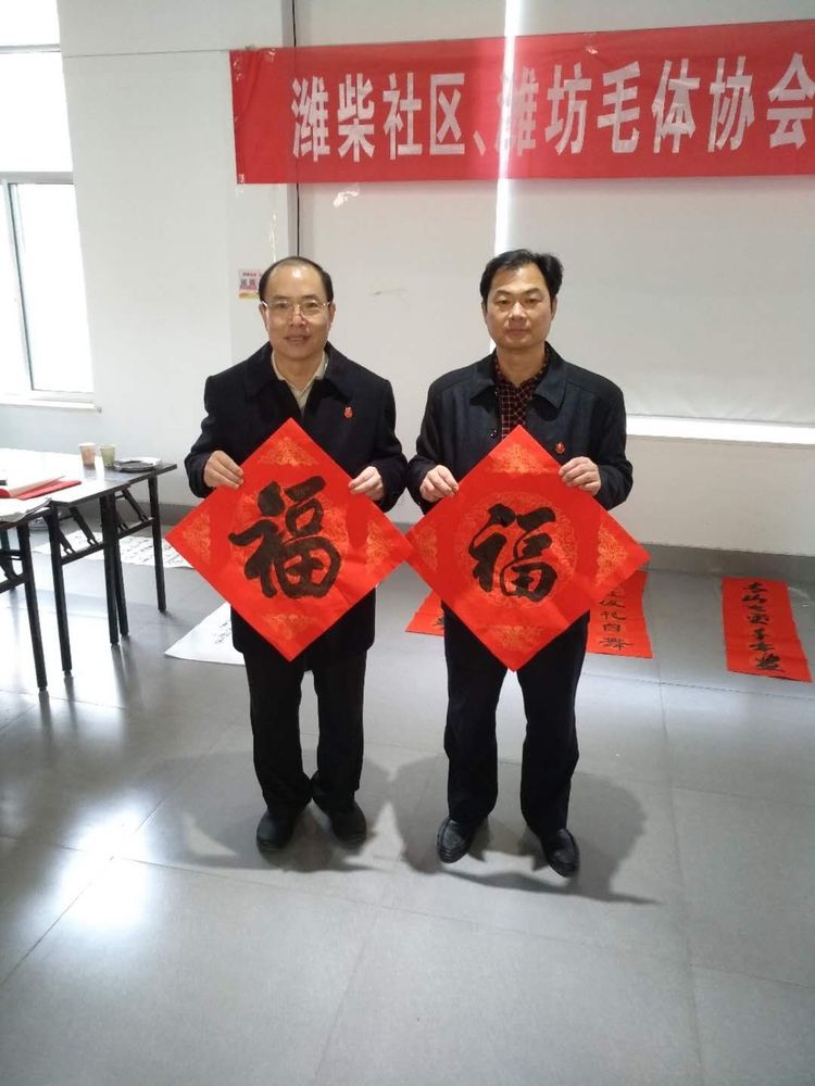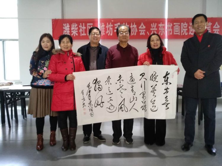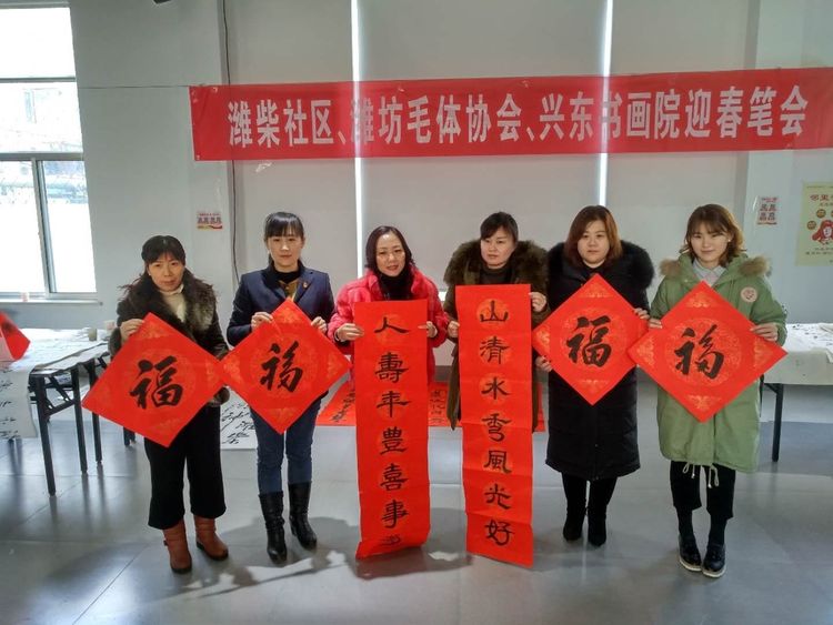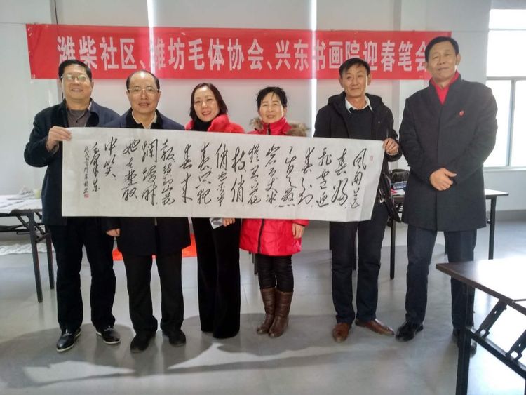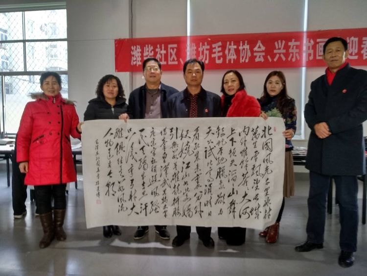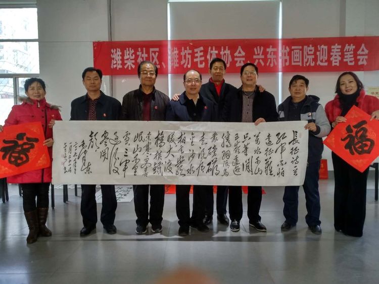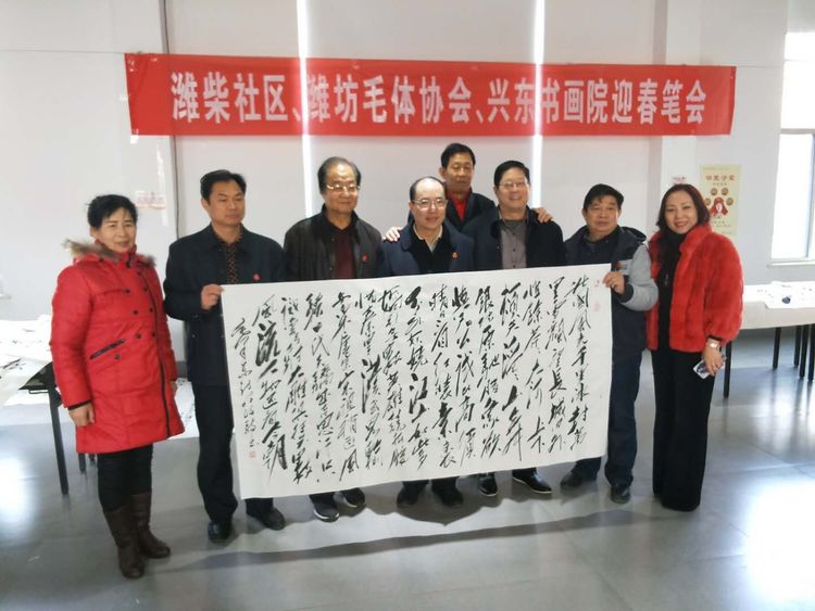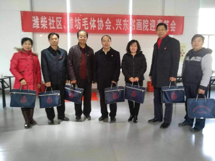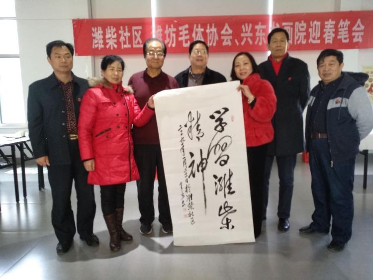 应潍柴社区盛邀,腊月十六潍坊毛体协会、兴东书画院11名书画爱好者在潍柴社区挥毫泼墨、笔走龙蛇,迎春送福笔会受到社区领导一致好评。大家一致认为,这次活动是学习潍柴、学习谭旭光精神的具体行动,笔会中,双方达成长期友好、互相交流学习的共识。