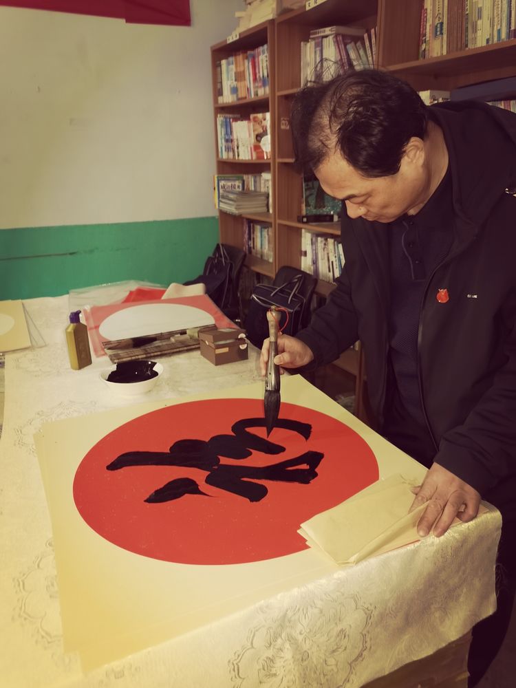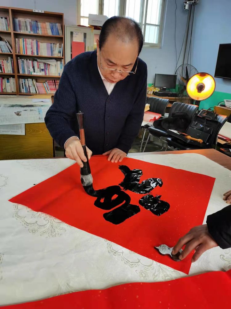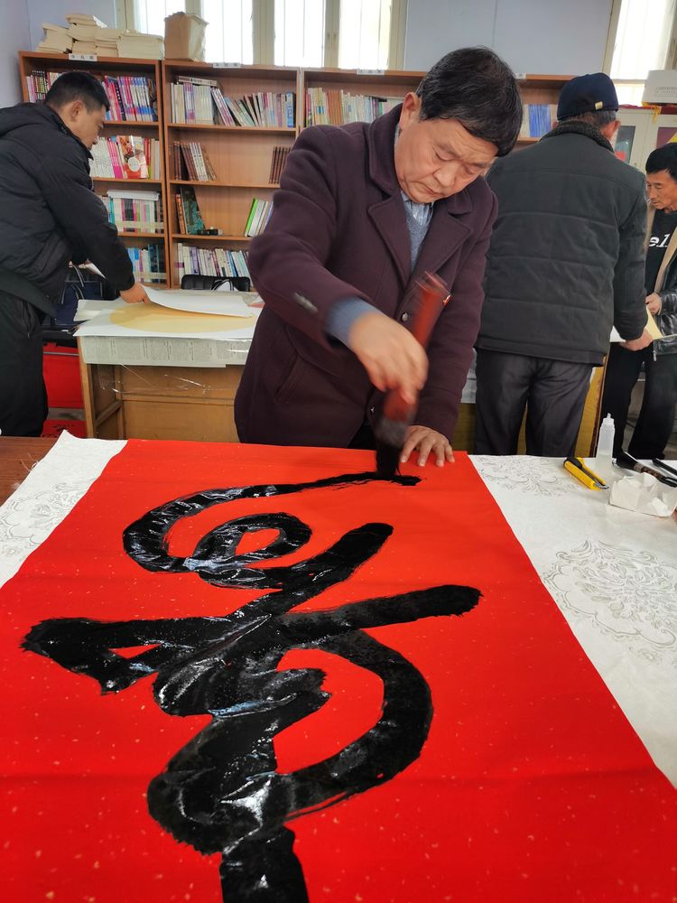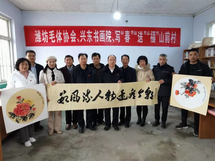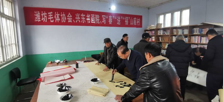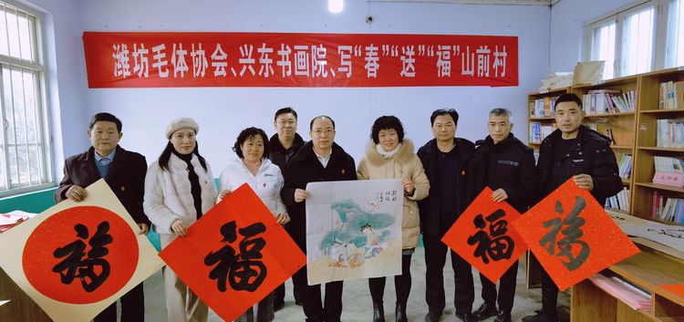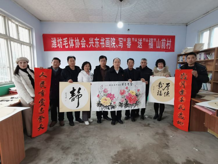 瑞雪兆丰年,2022年1月10日、农历腊月初八,在潍坊市委宣传部、潍坊市民政局的正确领导、大力支持和严格执行疫情防控要求的前提下,潍坊毛体协会会长、兴东书画院院长武法村带领协会的部分书画家到潍坊市峡山区郑公街道山前村进行“翰墨迎新春、书画贺新年”写春联送“福”字书画惠民笔会活动。