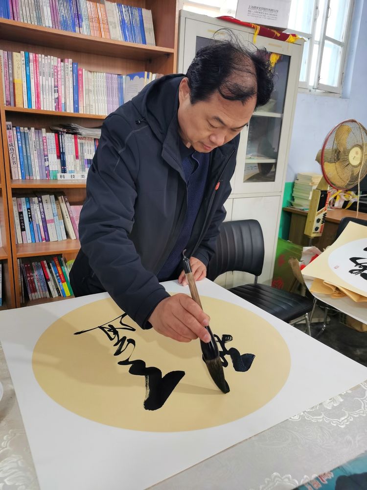 潍坊毛体协会会长、兴东书画院院长武法村在创作书法作品