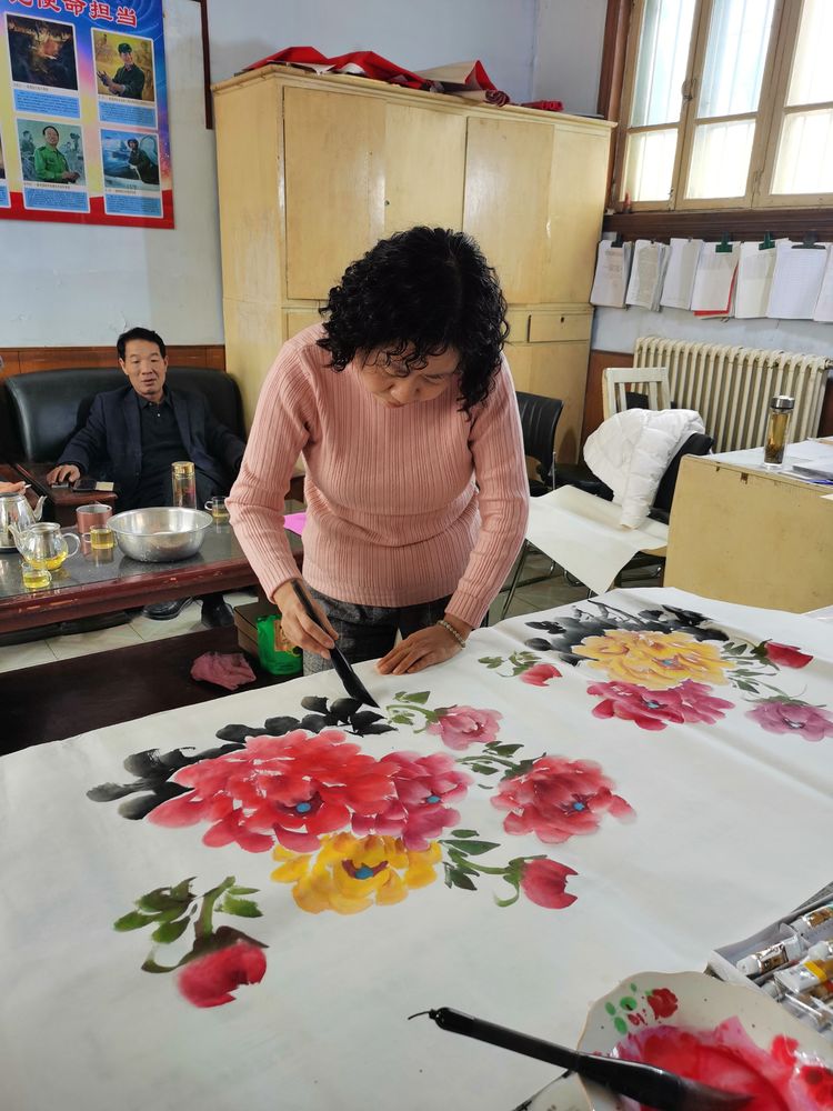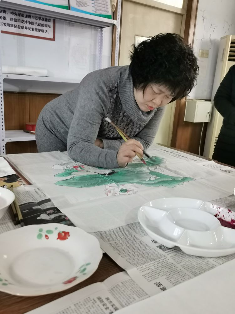 潍坊毛体协会、兴东书画院常务理事考玉梅在创作国画作品