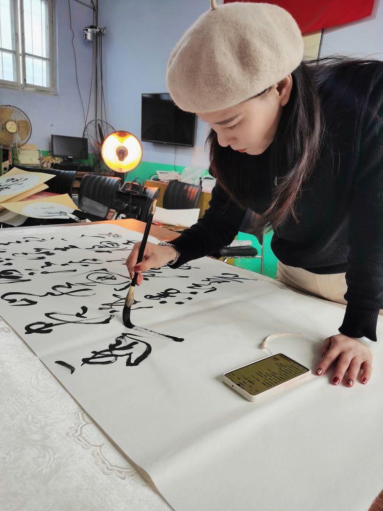 潍坊毛体协会副会长、兴东书画院副院长齐小姣在创作书法作品