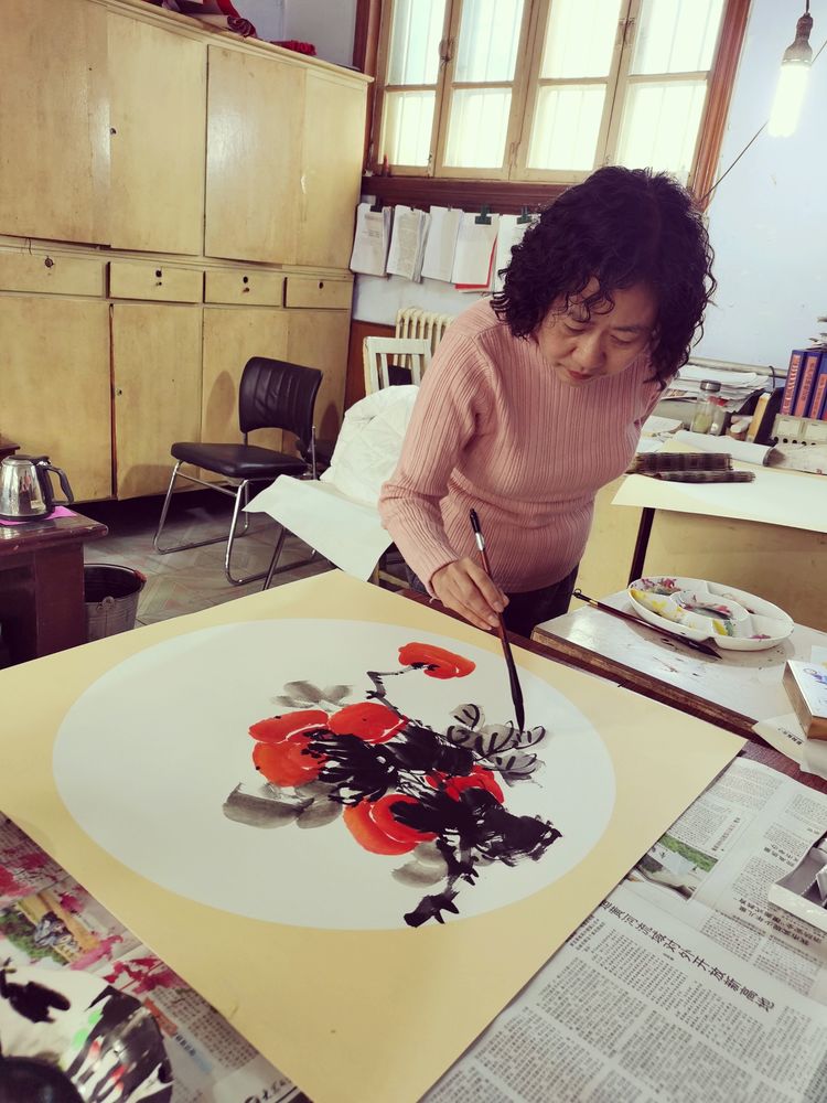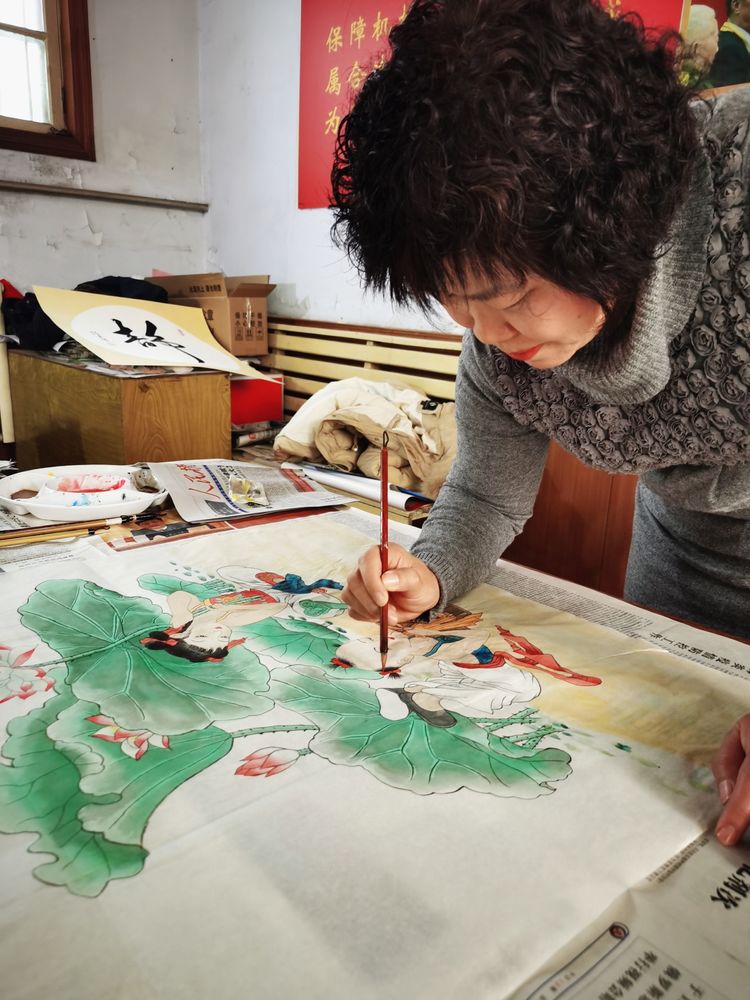 潍坊毛体协会、兴东书画院常务理事辛宏蕾在创作国画作品