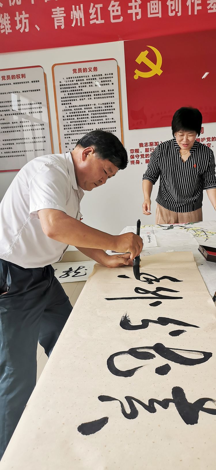 在中国共产党建党99周年即将到来之际,2020年6月24日上午在潍坊市寒亭区泰祥花苑社区泰祥物业管理有限公司党支部会议室,由潍坊.青州红色书画基地、潍坊毛泽东书法艺术研究会、潍坊兴东书画院、寒亭区宣传部、寒亭区文联、景芝酒业、寒亭区泰祥居委会、泰祥物业管理有限公司(红色物业)联合举办了“庆祝中国共产党建党99周年暨中国毛体书法家协会潍坊、青州红色书画创作基地成立6周年座谈会”。