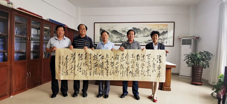 会上由崔金言同志主持并总结、汇报了六年来潍坊、青州红色基地和潍坊毛体书法协会、潍坊兴东书画院的具体工作情况:2014年6月26日、27日中国毛体书法协会分别在潍坊、青州建立了两个红色书画创作基地。六年来,以习近平新时代中国特色社会主义思想为指导,坚持不忘初心、牢记使命,积极践行弘扬毛体书法,传承红色文化,努力用毛体书法服务于社会。回顾基地六年来的发展史,感慨颇深,六年前景学勤会长亲自带领中国毛体书法协会的领导为我们两个基地揭牌,为弘扬毛体书法,传承红色文化奠定了坚实基础。六年来基地与潍坊市毛体书法艺术研究会、兴东书画院在各级领导的大力支持和同志们的共同努力下,取得了以下可喜的成绩,主要有以下几点:(一)组织举办了两次全国性的纪念毛泽东同志诞辰大型书画展。第一次是2015年11月15日在寒亭区根雕城举办“纪念毛泽东诞辰122周年全国书画展”,共展出作品400余幅;第二次是2018年12月19日在潍坊紫京大酒店举办“纪念毛泽东同志诞辰125周年全国书画展”,展出作品300多幅。两次大展在全国影响比较大,反映比较好。(二)协助李克先、张世忠二位优秀的毛体书法家分别在潍坊十笏园美术馆和郭味蕖美术馆举办了个人毛体书法展,受到了群众的高度赞扬和评价。(三)2015年8月28日举办了“纪念中国人民抗日战争暨世界反法西斯战争胜利70周年书画展”。(四)2015年4月10日为寒亭区高里街道南王村患白血病的女孩王凯萍举办爱心书画笔会捐款活动,酬集善款1.2万元,全部转交王凯萍的家属用于病人治疗。(五)2018年3月18日组织召开了以武法村为会长的新的领导班子。(六)2019年12月22日建立了潍坊毛体书法艺术研究会寿光分会,壮大了毛体队伍。(七)组织建立了潍坊毛体书法艺术研究会网站和公众号,随时发布活动信息情况。(八)每年“八一”建军节前,组织书画家到驻潍部队进行书画联谊活动,慰问部队军官。(九)每年在各个重要节日前组织书画家到企业、社区、农村等单位举行书画笔会,深受广大群众的欢迎。(十)今年疫情期间,组织会员创作抗疫作品,举办网上画展,敬英雄、送瘟神、鼓斗志、战病魔。(十一)积极参与宣传、文化部门组织的公益活动。