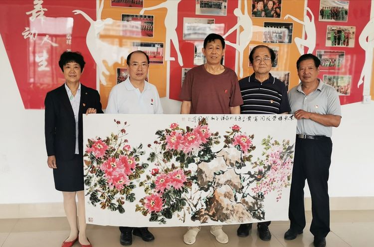 崔金言同志、武法村同志、张爱新同志、张兴香同志与韩介国同志创作的六尺国画作品《牡丹》合影留念