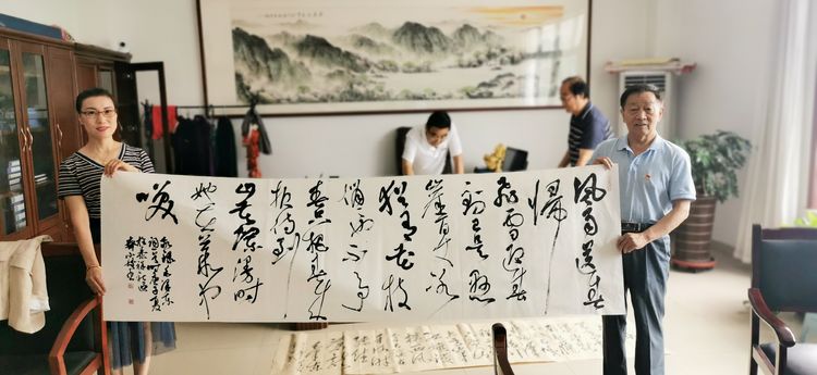 区文联主席牟兴建同志在观看韩介国、毛峰两位书画家创作