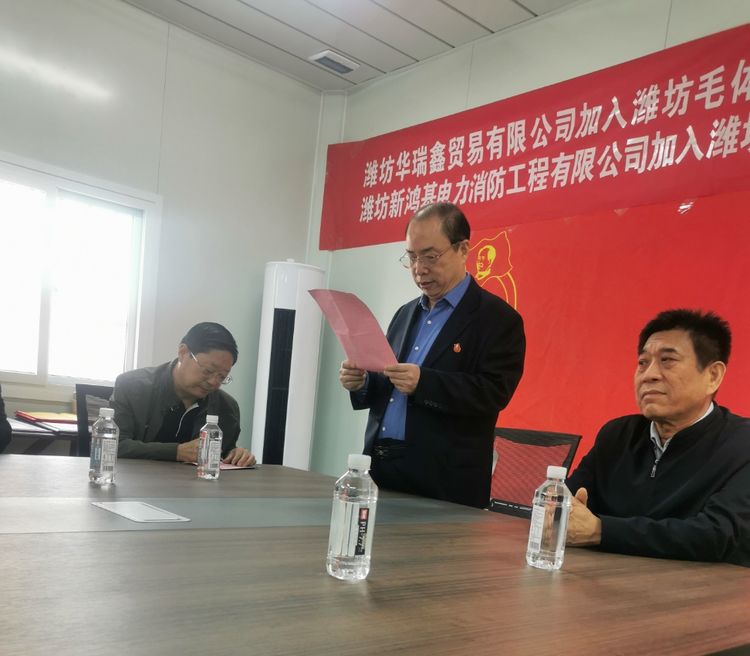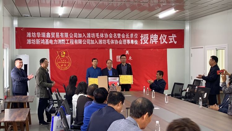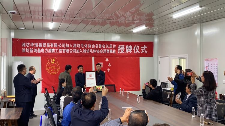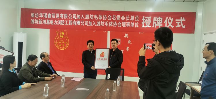 三:原奎文区政协主席、潍坊毛体协会名誉会长李洪勤同志为新加入的潍坊华瑞鑫贸易有限公司董事长刘春华同志颁发“潍坊毛体协会名誉会长单位”、“潍坊兴东书画院名誉院长单位”牌匾;为潍坊新鸿基电力消防工程有限公司董事长张福全同志颁发“潍坊毛体协会理事单位”、“潍坊兴东书画院理事单位”牌匾。