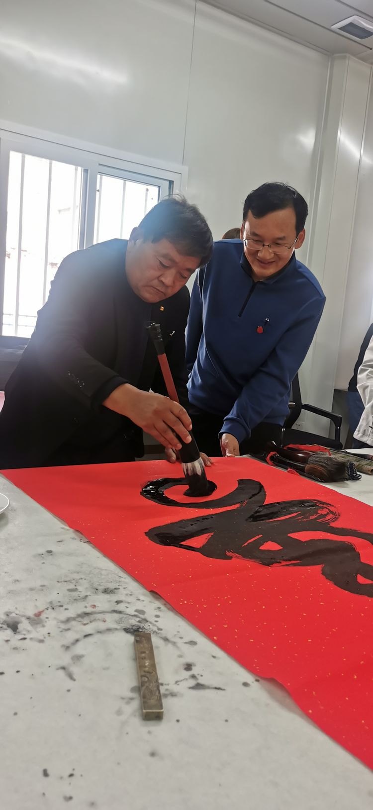 出席本次活动的主要领导有:奎文区原政协主席、潍坊毛体协会名誉会长、潍坊兴东书画院名誉院长李洪勤同志;潍坊毛体协会会长、党支部书记、潍坊兴东书画院院长武法村同志;武家党总支书记武法实同志;中建国际投资集团潍坊项目部经理周哲同志;潍坊华瑞鑫贸易有限公司董事长刘春华同志;潍坊新鸿基电力消防工程有限公司董事长张福全同志;潍坊毛体协会副会长、潍坊兴东书画院副院长:韩介国、孙建伟、刘玉清、王金豹、齐小姣,秘书长谭金霞同志,常务理事:于龙浩、辛宏蕾、考玉梅;潍坊毛体协会、潍坊兴东书画院艺术顾问、总监赵伟东同志;书法家:李树庆、谭志刚、孙宣华同志。同时在场的还有中建集团潍坊项目部、武家合作社的多位领导及工作人员。