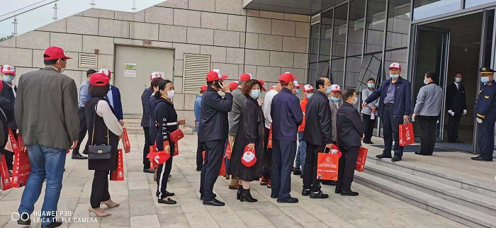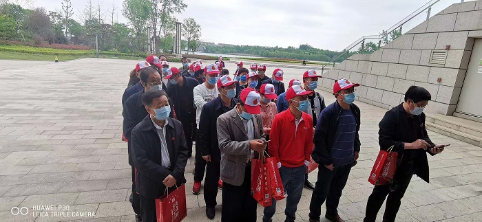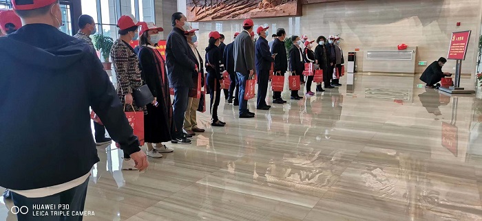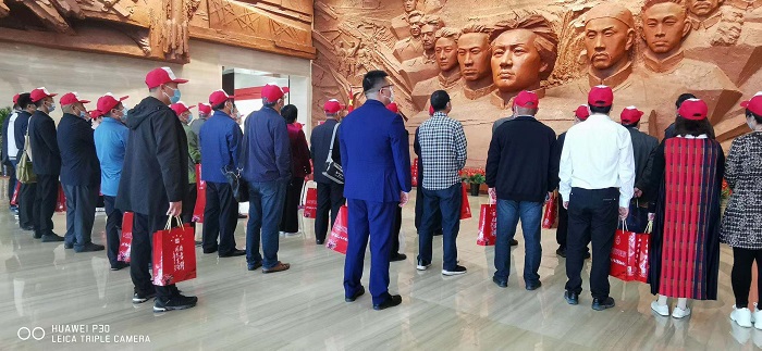 下面是活动的详细报道:上午八点半参会人员到潍坊党性教育基地使命担当主题展馆集合,王金豹副会长负责对每位到场人员测量体温,齐小姣、孙建伟等同志负责请大家填写入馆人员备案登记表,协会徐主任为参观人员发放《“数风流人物,还看今朝”——潍坊毛泽东书法艺术研究会庆祝中国共产党建党一百周年书画作品集》。上午九点十分大家戴统一会徽、遮阳帽排队整齐划一入馆参观学习。