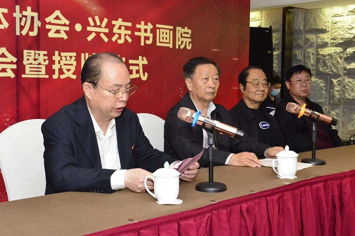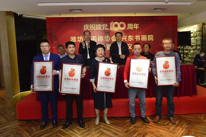 原潍坊市委常委,秘书长,潍坊毛体协会名誉会长,潍坊兴东书画院名誉院长李光信同志为以下五家名誉会长、名誉院长单位授牌:潍坊华普实业发展有限公司,潍坊亚诗贝酒店管理有限公司,潍坊成泰钢铁贸易有限公司,广东粵星钢业有限公司,烟台市港湾运贸有限公司。