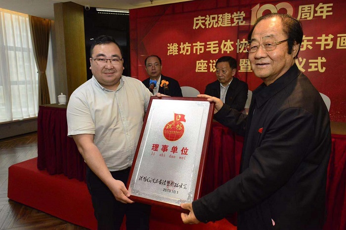 中国毛体协会副会长,潍坊毛体协会党支部书记,潍坊兴东书画院院长武法村同志为以下四家理事单位授牌:山东坤腾冶金机械设备有限公司,上海闪达实业有限公司,潍坊至大建筑工程有限公司,又时声音制造。
