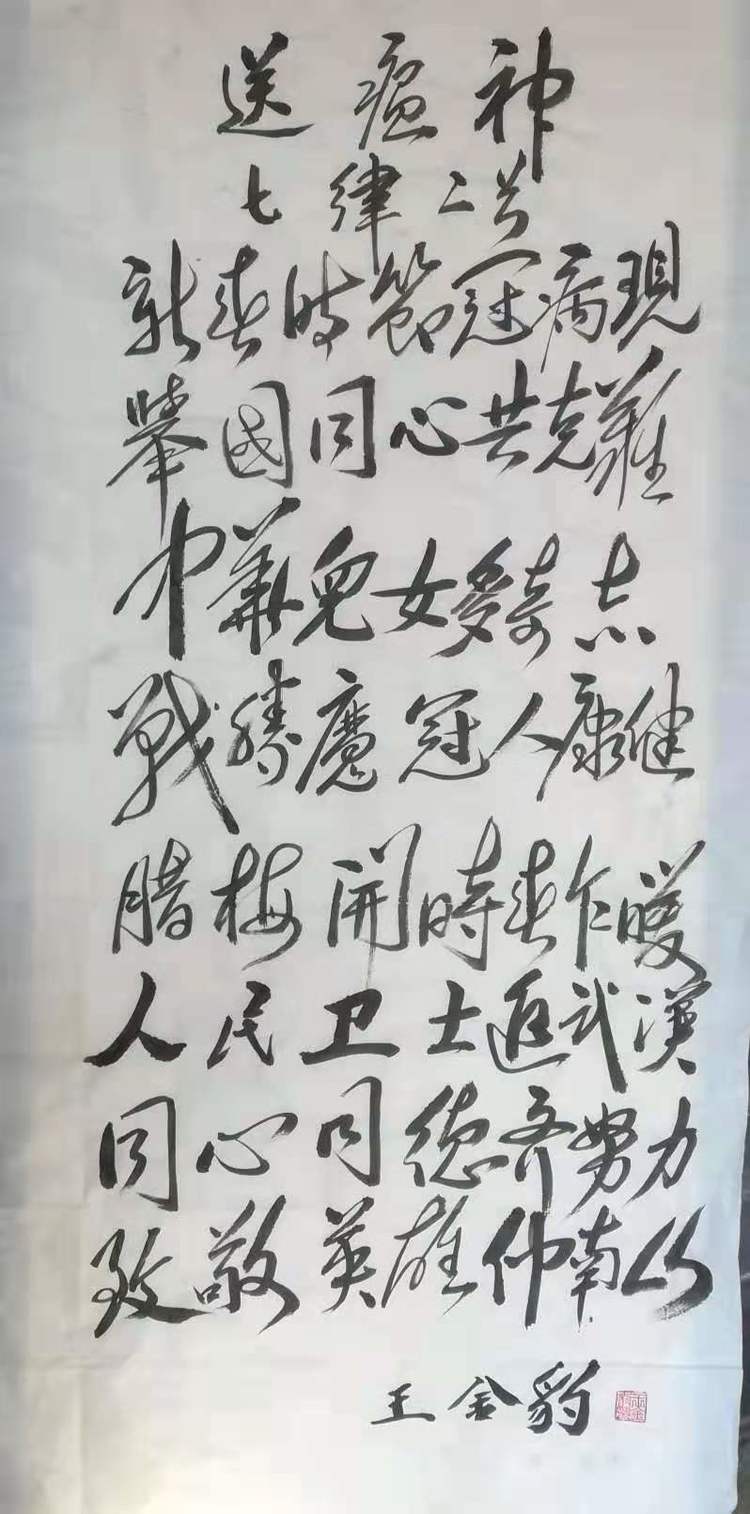 潍坊毛体协会会员、潍坊兴东书画院院士王学川同志不仅用书法来鼓舞斗志,而且用诗词的形式鼓舞人心,歌颂战斗在前线的医务工作人员: