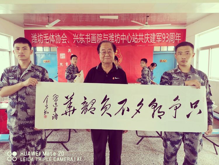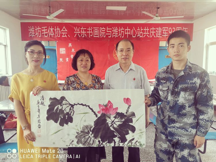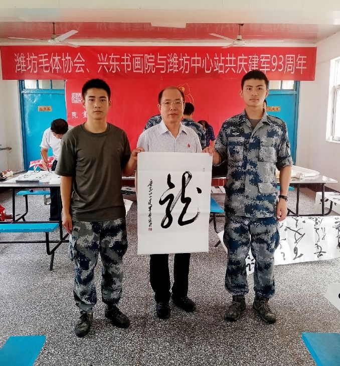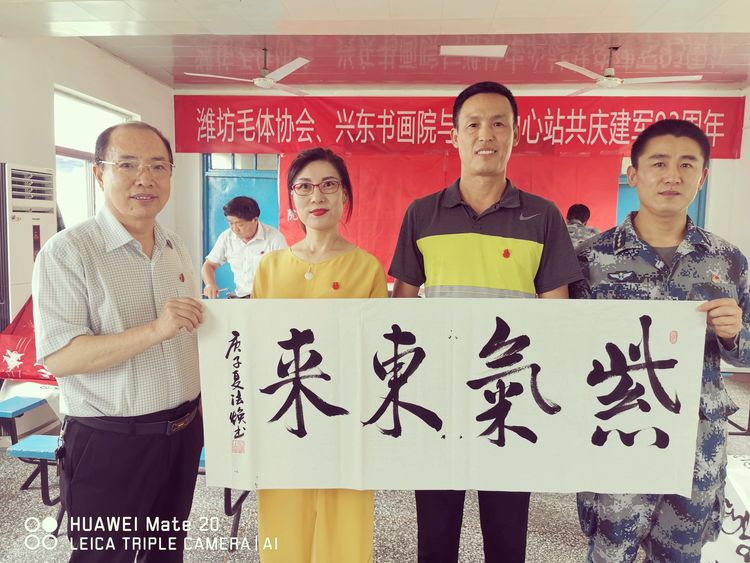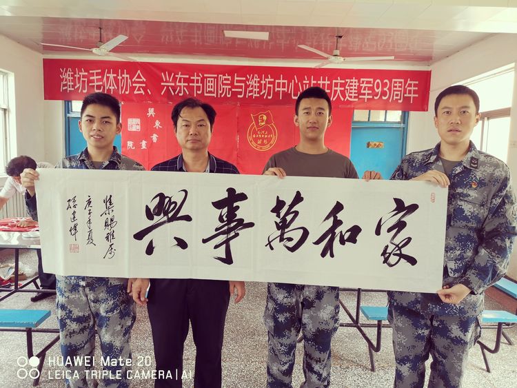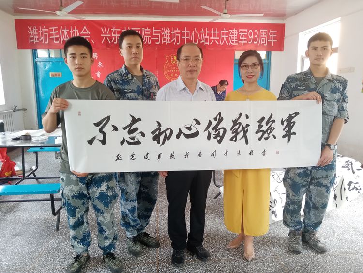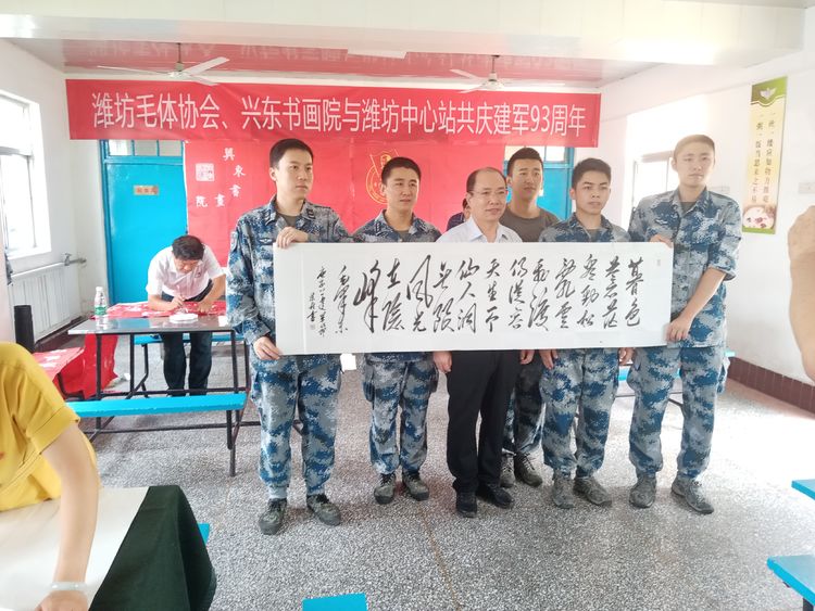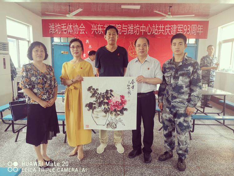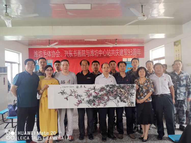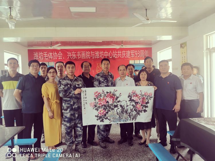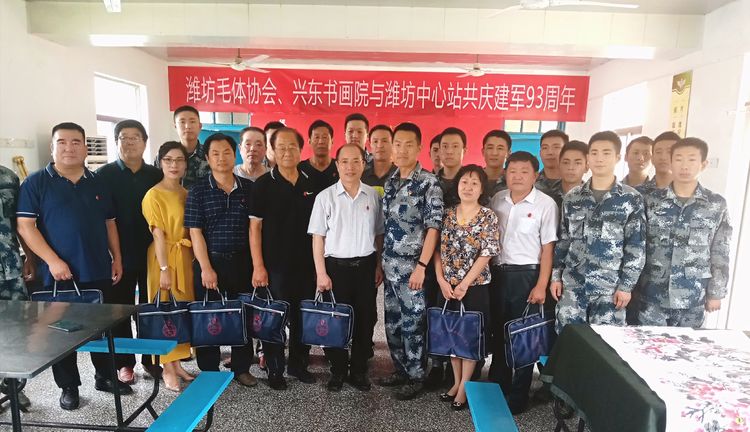 在潍坊市委宣传部、市民政局的正确领导和大力支持下,2020年 7月29日上午,潍坊毛体协会、潍坊兴东书画院共十二位会员、院士在协会会长、党支部书记、法人代表武法村同志的带领下,第二次走进了潍坊空军雷达某部开展“庆八一 .进军营”笔会活动,用特殊的艺术礼物祝贺广大官兵节日快乐,表达了人民群众与部队官兵的鱼水之情。