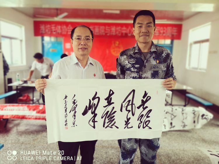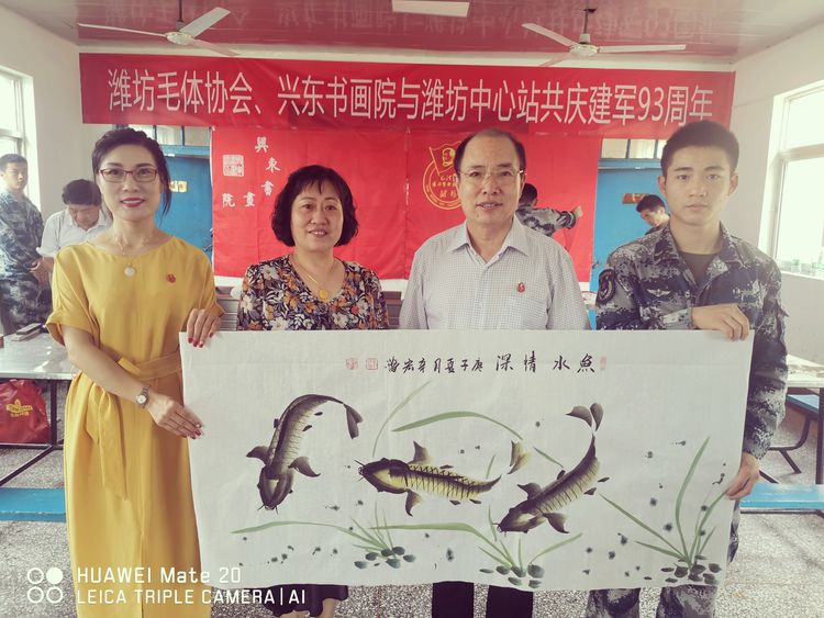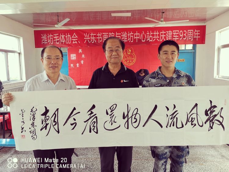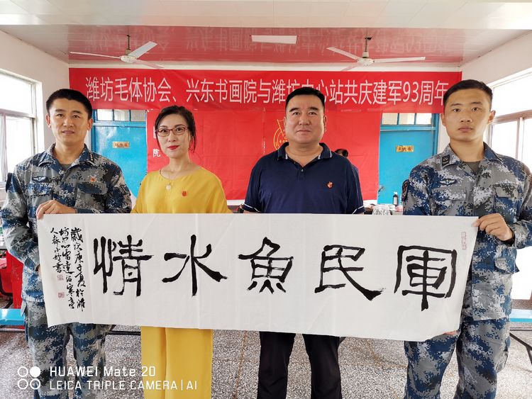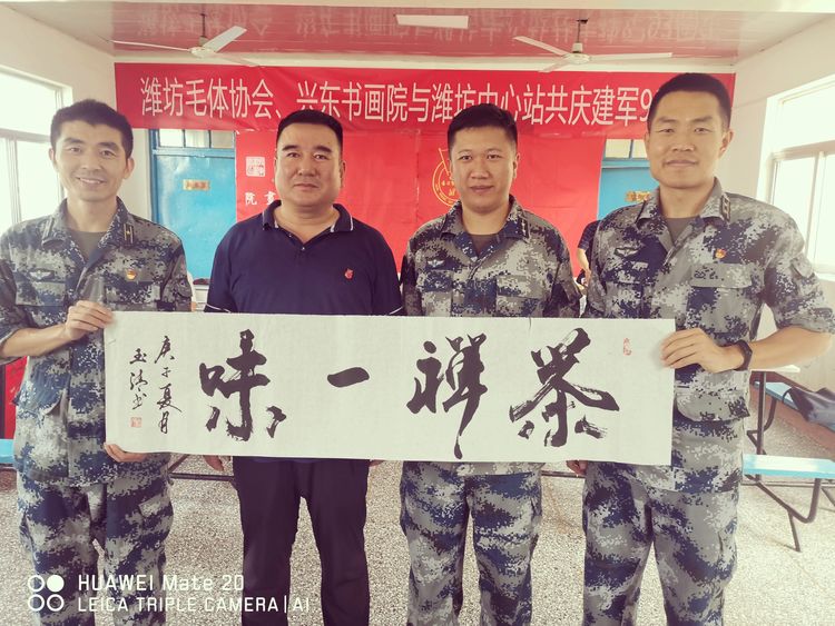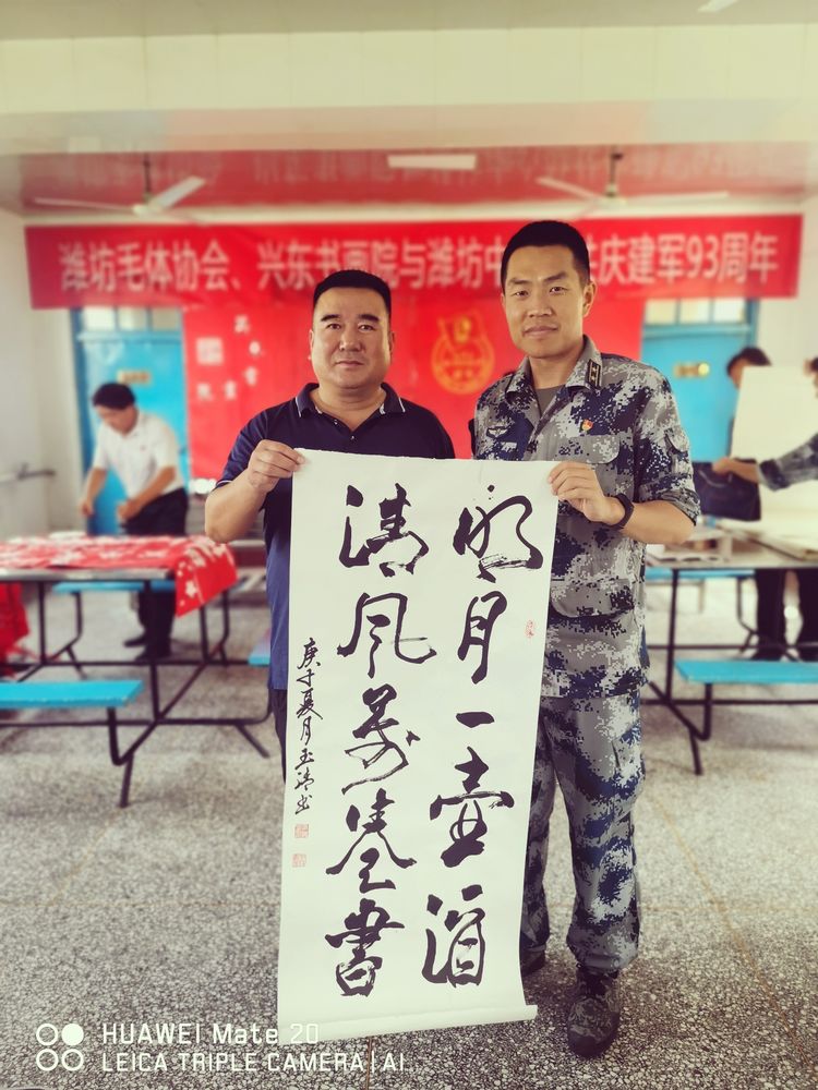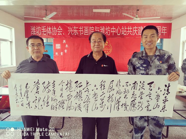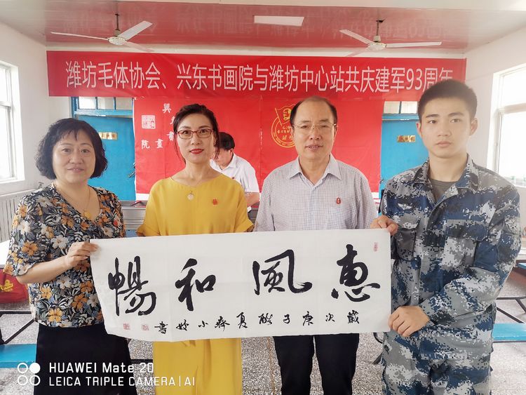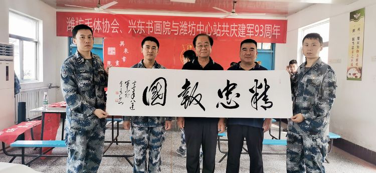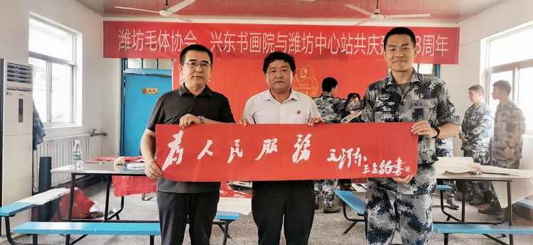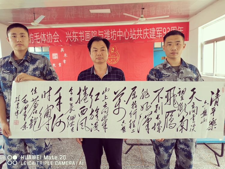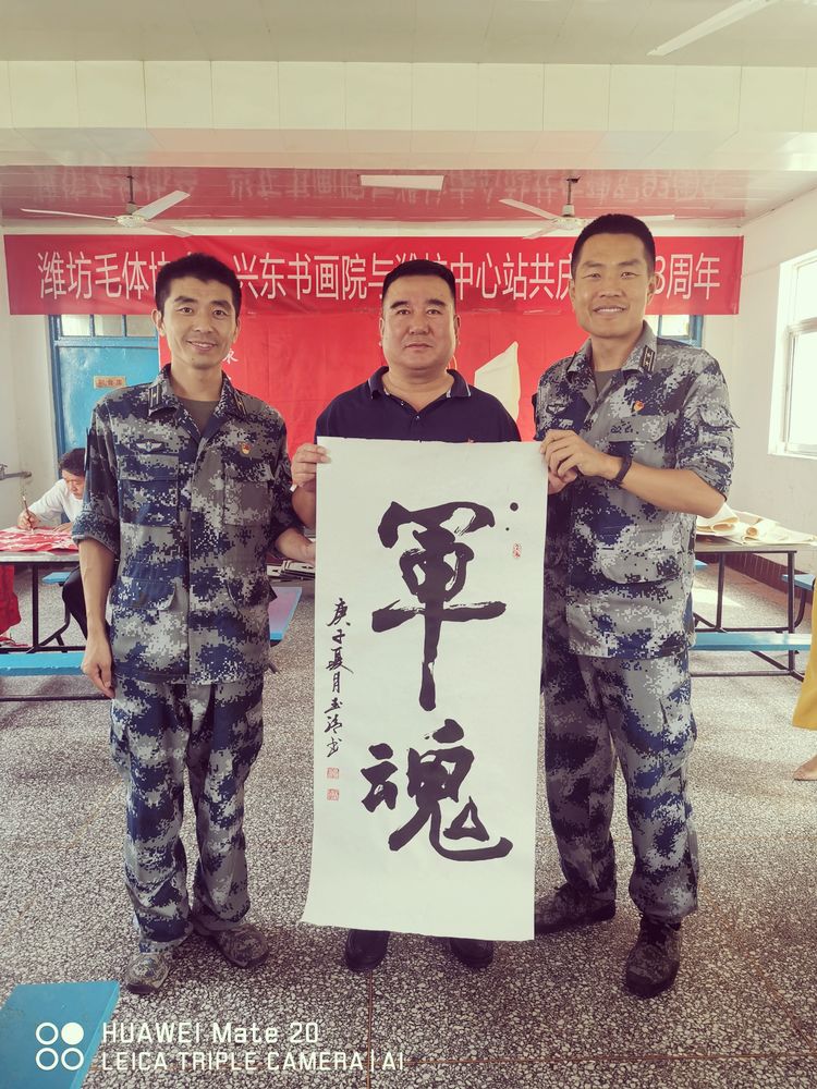 在潍坊市委宣传部、市民政局的正确领导和大力支持下,2020年 7月29日上午,潍坊毛体协会、潍坊兴东书画院共十二位会员、院士在协会会长、党支部书记、法人代表武法村同志的带领下,第二次走进了潍坊空军雷达某部开展“庆八一 .进军营”笔会活动,用特殊的艺术礼物祝贺广大官兵节日快乐,表达了人民群众与部队官兵的鱼水之情。