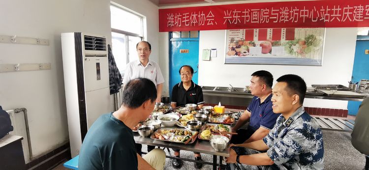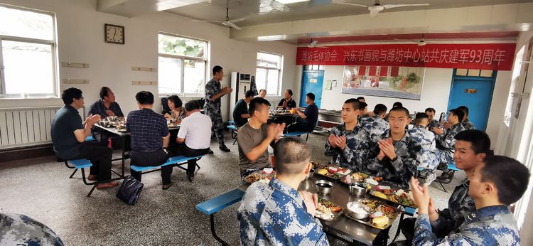 中午潍坊毛体协会、潍坊兴东书画院领导班子与部队官兵共进午餐,辛教导员主持会议并讲话,协会党支部书记武法村同志做了拥军爱民活动意义及活动内容的讲话。