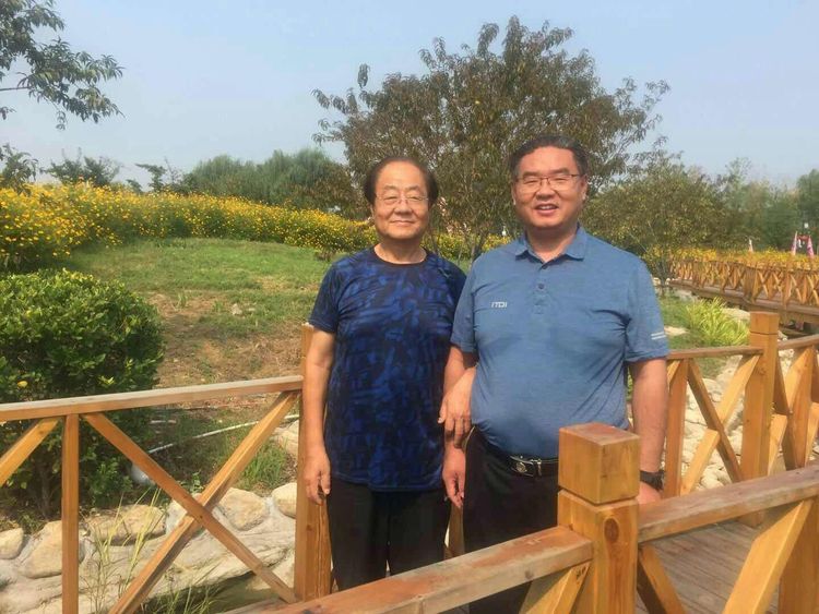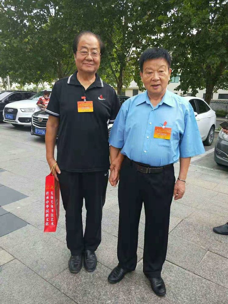 中国毛体书法家协会副会长、潍坊毛体协会名誉会长崔金言同志在泰山花海与中国毛体协会副会长兼秘书长孔维阳同志合影留念。